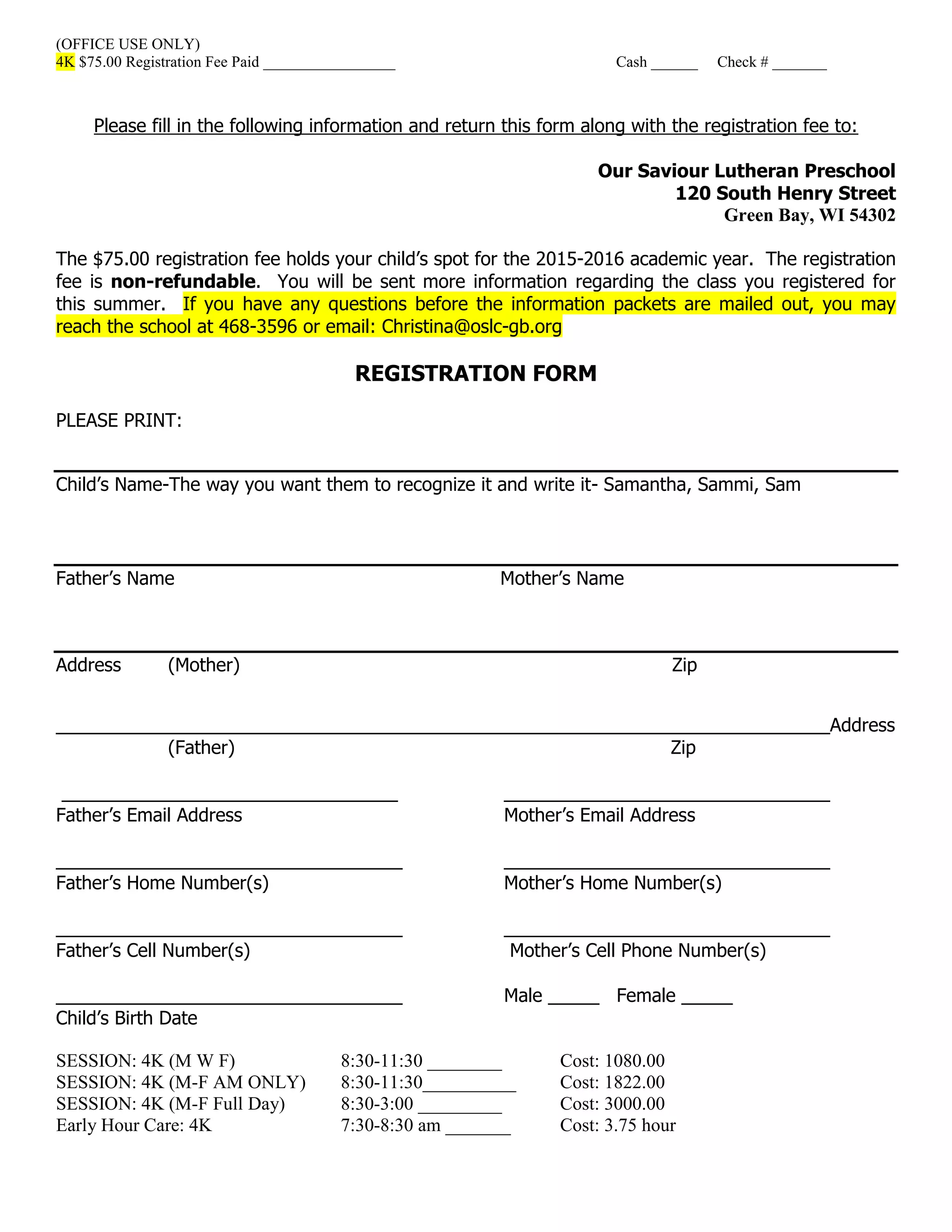 The document is a registration form for Our Saviour Lutheran Preschool's 2015-2016 academic year. It includes fields to provide contact information for parents and the child as well as select a session and indicate if early hour care is needed. The $75 registration fee reserves a spot for the year and is non-refundable, with more information to be provided over the summer.