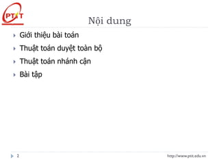 Tài liệu trình bày các bài toán tối ưu, bao gồm thuật toán duyệt toàn bộ và nhánh cận để tìm phương án tối ưu cho các bài toán như cái túi, người du lịch, cho thuê máy, và phân công công việc. Mỗi bài toán được mô tả với tập phương án, hàm mục tiêu, đầu vào và đầu ra. Tài liệu nhấn mạnh về cách xây dựng quy tắc và phương pháp giải cho các bài toán này.