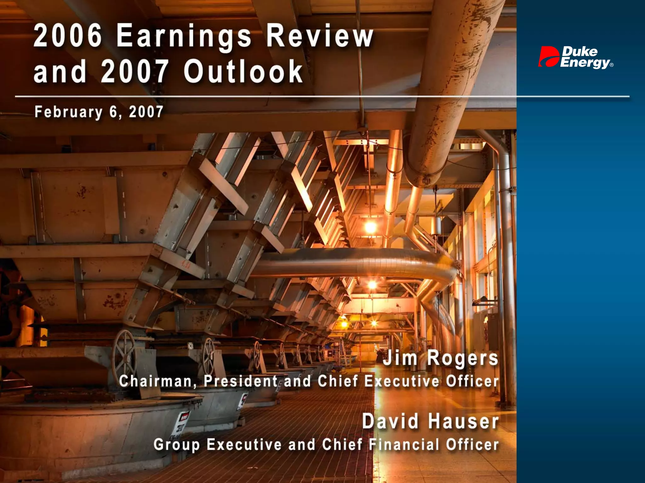 This document summarizes Duke Energy's financial performance in the 4th quarter and full year of 2006. Key points include: - Ongoing diluted EPS for 2006 was $1.81, up from $1.73 in 2005, due to the addition of Cinergy offset by lower results at Crescent and International. - Commercial Power results declined due to purchase accounting charges related to the Cinergy merger and losses from Midwest gas plants. - International Energy results decreased because of lower earnings at National Methanol. - Interest expense increased in 4Q06 primarily due to the Cinergy merger. The effective tax rate also declined due to tax settlements and other factors.