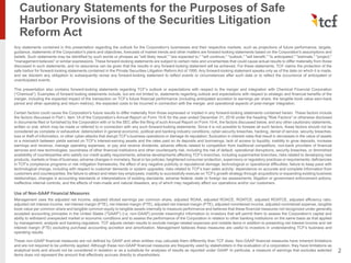 TCF Financial Corporation held a 4Q19 earnings presentation on January 27, 2020. The presentation contained forward-looking statements regarding TCF's financial performance and the merger with Chemical Financial Corporation. The presentation also contained cautionary language stating that TCF's actual future results could differ from projected results due to risks and uncertainties. TCF provided non-GAAP financial measures to allow for comparisons between periods and other institutions, but warned that non-GAAP measures have limitations. TCF reported diluted EPS of $0.72 but adjusted diluted EPS was $1.04. Integration of the merger was on track and loan growth was strong, particularly in commercial loans, while credit quality remained solid.