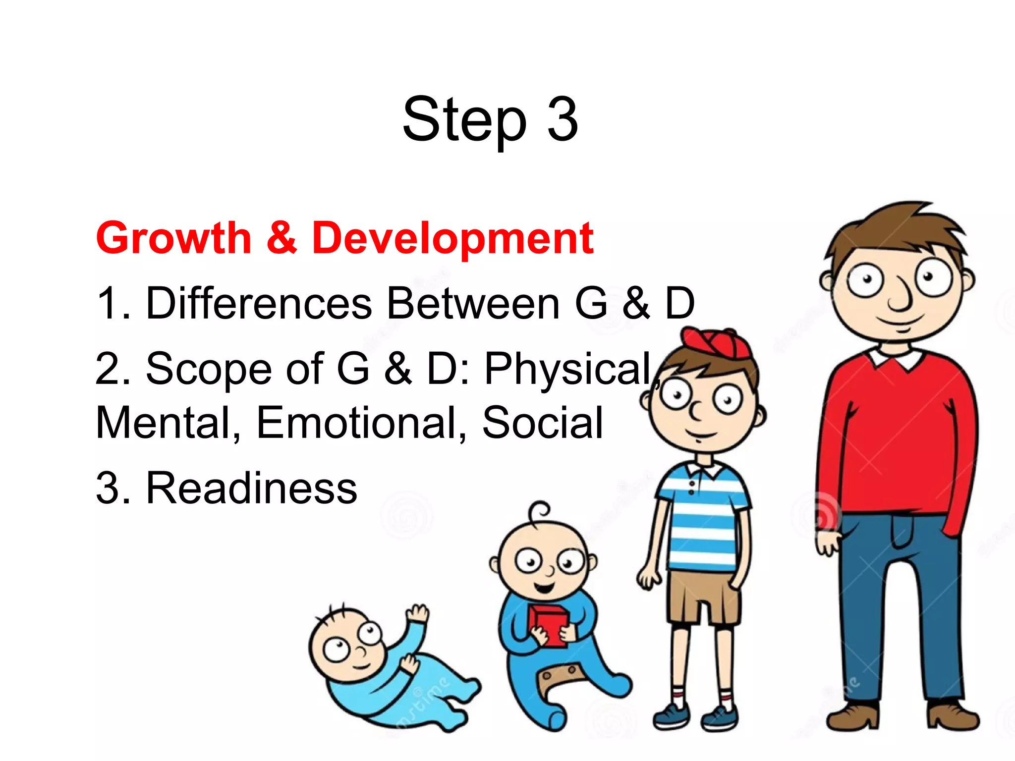 1. Growth and development involve the progressive increase in size and skills over time. Growth refers to increases in size, while development is the acquisition of abilities.