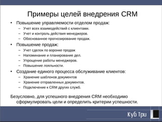 Презентация о sugarcrm Community Edition описывает цели внедрения CRM, такие как повышение продаж и управление отделами. Sugarcrm предлагает бесплатное программное обеспечение, открытый исходный код и доступ из любого места через интернет, что снижает затраты на внедрение. Программа поддерживает интеграцию с различными модулями и технологиями, а также предоставляет широкие возможности для доработки под бизнес-процессы клиентов.