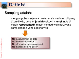 Dokumen ini membahas prosedur dan metode manajemen limbah, khususnya dalam pengambilan sampel air untuk analisis lingkungan. Berbagai metode sampling dijelaskan, termasuk teknik untuk air permukaan, air tanah, dan air limbah, serta persyaratan alat dan wadah yang harus memenuhi standar tertentu. Selain itu, terdapat penjelasan mengenai lokasi yang tepat untuk pengambilan sampel demi memastikan representativitas hasil analisis.