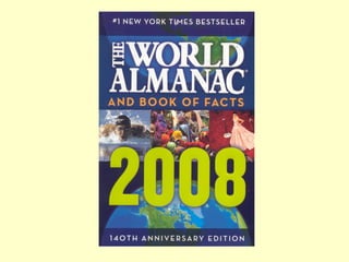 The document discusses different types of indexes used in almanacs to locate information. It explains that a quick thumb index uses broad subjects alphabetically, while a quick reference index lists more specific subjects on one page. A general index is multipage and lists very specific subjects and subheadings. The document then provides directions for an activity where students work with partners to use an almanac to answer questions, bringing their answers to the teacher to check. It emphasizes carefully reading the questions to identify key words to look up answers.