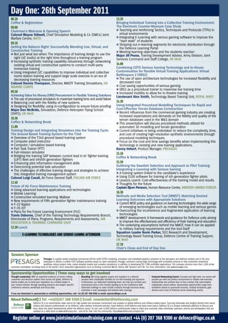 The document advertises the 4th annual Joint Simulation & Training conference which will take place from August 26-28, 2011 in London. The conference will explore opportunities and challenges of simulated training systems and discuss topics like blended training, simulator interoperability, and pre-mission rehearsals. It will also cover the value of distance learning, serious gaming, and e-learning technologies. The document provides details on registration, speakers, sessions, and workshops on topics such as next generation learning technologies, standardization and interoperability of simulation technologies.