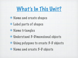 This document provides an overview of the key topics and concepts covered in a 4th grade geometry unit, including learning to name, classify, and create different shapes (triangles, squares, circles etc.), polygons, and 3D objects; it also suggests various activities and online resources to reinforce these geometric concepts.