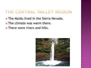 The Maidu people lived in the warm Sierra Nevada mountains near rivers and hills. They built roundhouses out of bark, brush and dirt for shelter. For food, they gathered acorns from trees and caught fish from rivers, using twine to make baskets and eating acorns and fish. The valleys and foothills provided additional shelter.