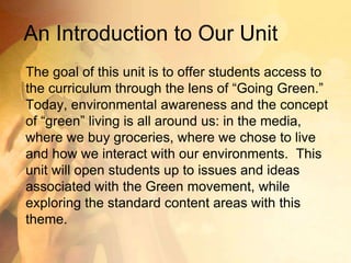 This document outlines a science unit plan focused on environmentalism and sustainability for 4th grade students. It includes essential questions about the environment, pollution, and how humans impact the environment. Students will learn about man-made and natural environments, different types of pollution, and ways to reduce waste through recycling and reuse. Assessments include worksheets, quizzes, rubrics and presentations to evaluate students' understanding of these topics.