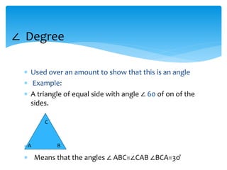 The document is an introduction to mathematical concepts, specifically focusing on angles, triangles, parallel lines, and basic proofs. It explains terms like right angles, the Frobenius inner product, and the ellipsis used in mathematical lists and representations. Examples are provided to illustrate how these concepts apply in mathematical reasoning and proofs.