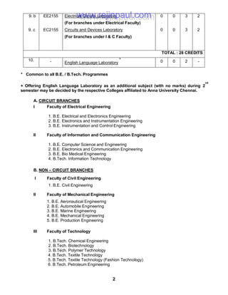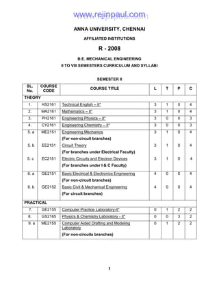 This document outlines the curriculum and syllabus for mechanical engineering students at Anna University in Chennai, India. It provides details of the courses offered each semester from semesters 2 through 8, including course codes, titles, credit hours, and brief descriptions. Some key courses include Technical English, Engineering Mechanics, Manufacturing Technology, Thermodynamics, Fluid Mechanics, Machine Design, and Project Work. The curriculum is designed to provide both theoretical knowledge through coursework as well as practical skills through laboratory sessions. Students have the opportunity to specialize in elective courses in areas such as thermal engineering, dynamics, and design.