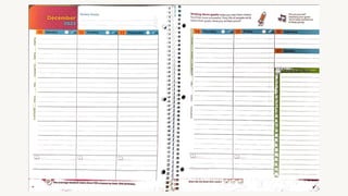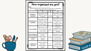 The document discusses different aspects of being organized, including having an organized backpack, desk, and home. It suggests organizing one's backpack by having designated spots for supplies like markers, pencils, and scissors. An organized desk means keeping writing tools together and papers sorted by subject. Being organized also involves using a planner to schedule tasks, keeping track of time, and writing down important dates.