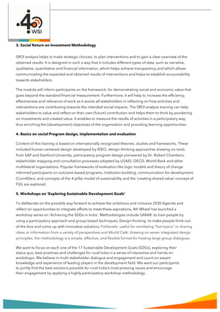 The document outlines a capacity development approach focusing on enhancing organizational abilities to achieve sustainable development goals through consultancy and training services. It details various training modules aimed at impact assessment, collective impact frameworks, social return on investment, social program design, sustainable development goals workshops, and effective reporting techniques. The programs are designed to engage stakeholders at all levels, fostering collaboration and innovative solutions for social change.