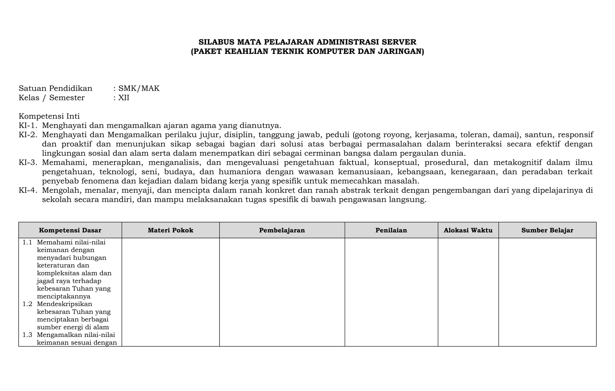 Dokumen ini adalah silabus untuk mata pelajaran administrasi server di SMK dengan fokus pada berbagai kompetensi teknis serta pemahaman nilai-nilai keimanan dan perilaku positif. Materi mencakup konfigurasi berbagai server seperti Samba, VPN, multimedia streaming, web, FTP, serta monitoring kinerja server. Penilaian dilakukan melalui laporan praktikum, observasi, dan tes pilihan ganda serta essay.