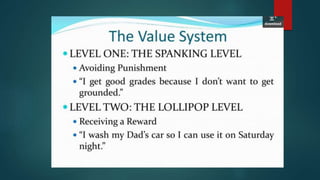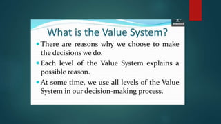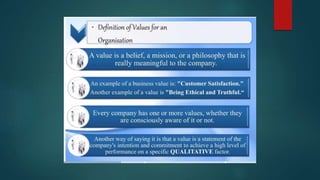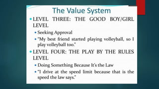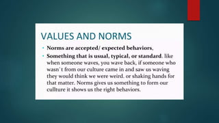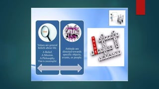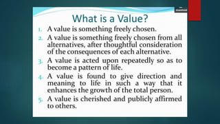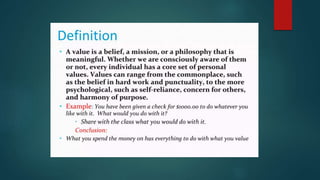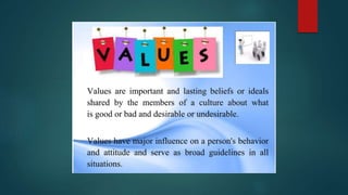 Values are freely chosen beliefs that guide behavior. Filipino values are centered around social harmony and derived from cultural, religious, and family influences. Some key Filipino values include pakikisama (getting along with others), utang na loob (debt of gratitude), and hiya (shame). These values emphasize cooperation, obligation, and avoiding embarrassment to maintain interpersonal relationships and social acceptance. The document provides several examples of how these values shape Filipino behavior and culture.