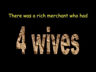 The document tells a story about a rich merchant on his deathbed who asks each of his four wives to follow him after death. His first three wives refuse, but his neglected first wife, who is skin and bones from malnutrition, agrees to follow him. The document suggests the four "wives" are our body, physical qualities, reputation, and soul - and that we often neglect our soul while pursuing wealth and pleasure.