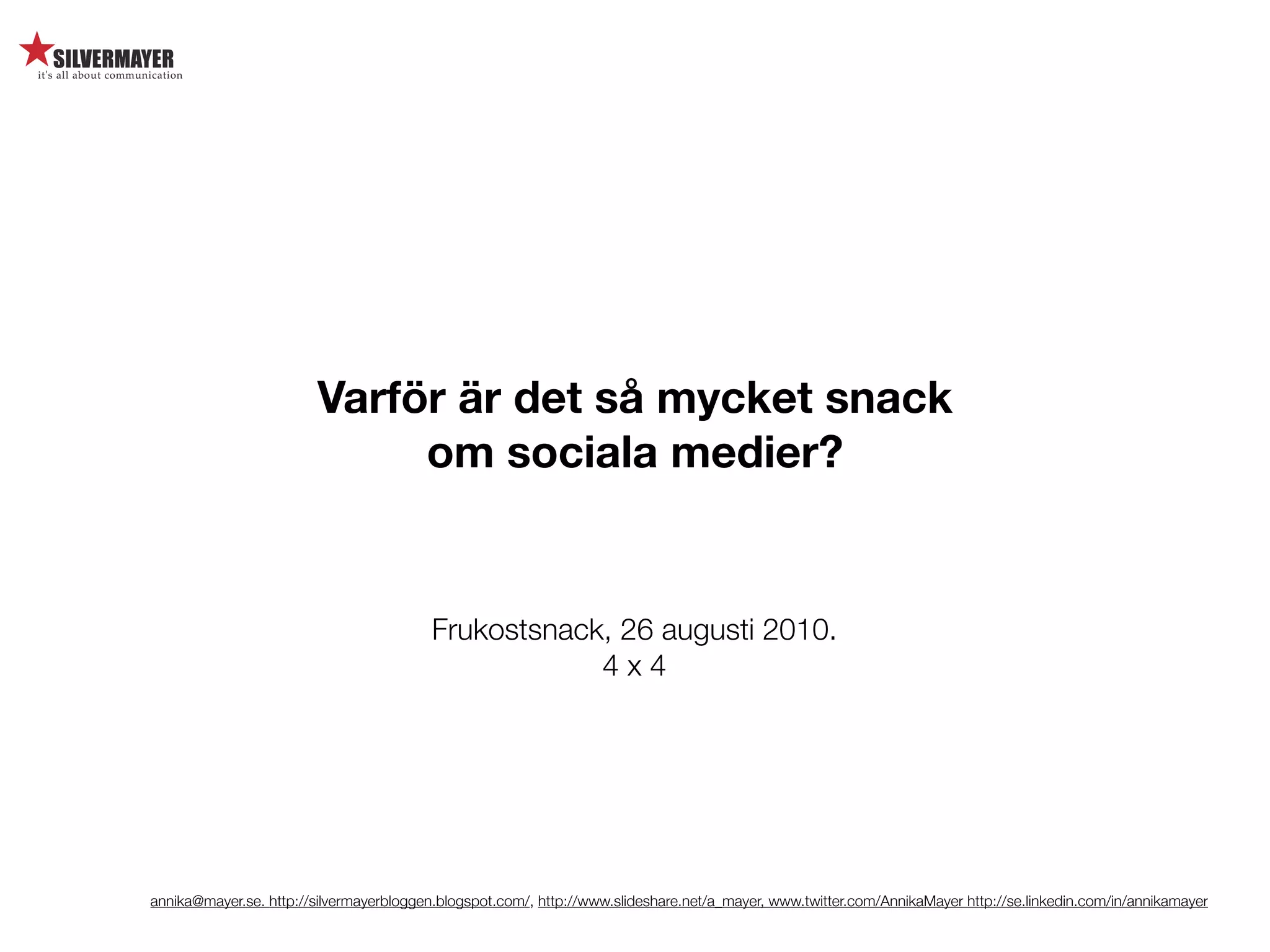 annika@mayer.se. http://silvermayerbloggen.blogspot.com/, http://www.slideshare.net/a_mayer, www.twitter.com/a_mayer http://se.linkedin.com/in/annikamayer