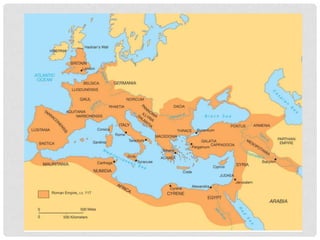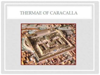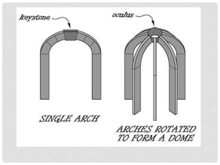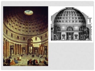 The Pantheon in Rome was commissioned in 118-126 CE and has remained remarkably well preserved. It has a large central dome with an oculus opening and a diameter of 43.3 meters. The dome is the world's largest unreinforced concrete dome. The Pantheon was an important architectural achievement due to its geometric proportions and use of concrete construction techniques.