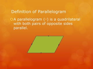 1) A parallelogram is a quadrilateral with both pairs of opposite sides parallel. 2) The document proves that in a parallelogram, opposite sides are congruent and opposite angles are congruent. 3) It also states that the diagonals of a parallelogram bisect each other.