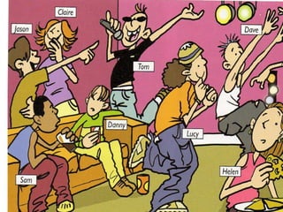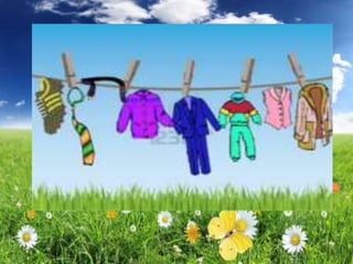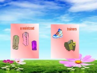 The document discusses different types of clothes that people wear. It asks questions about what someone is wearing and what another person is wearing. It then has a reading comprehension section about a Mr. Smith and what clothes he wears at work and at home in different weather conditions. It talks about shirts, trousers, coats, belts, sweaters, caps and raincoats. It ends by spelling out the word "CLOTHES" in a unique formatting.