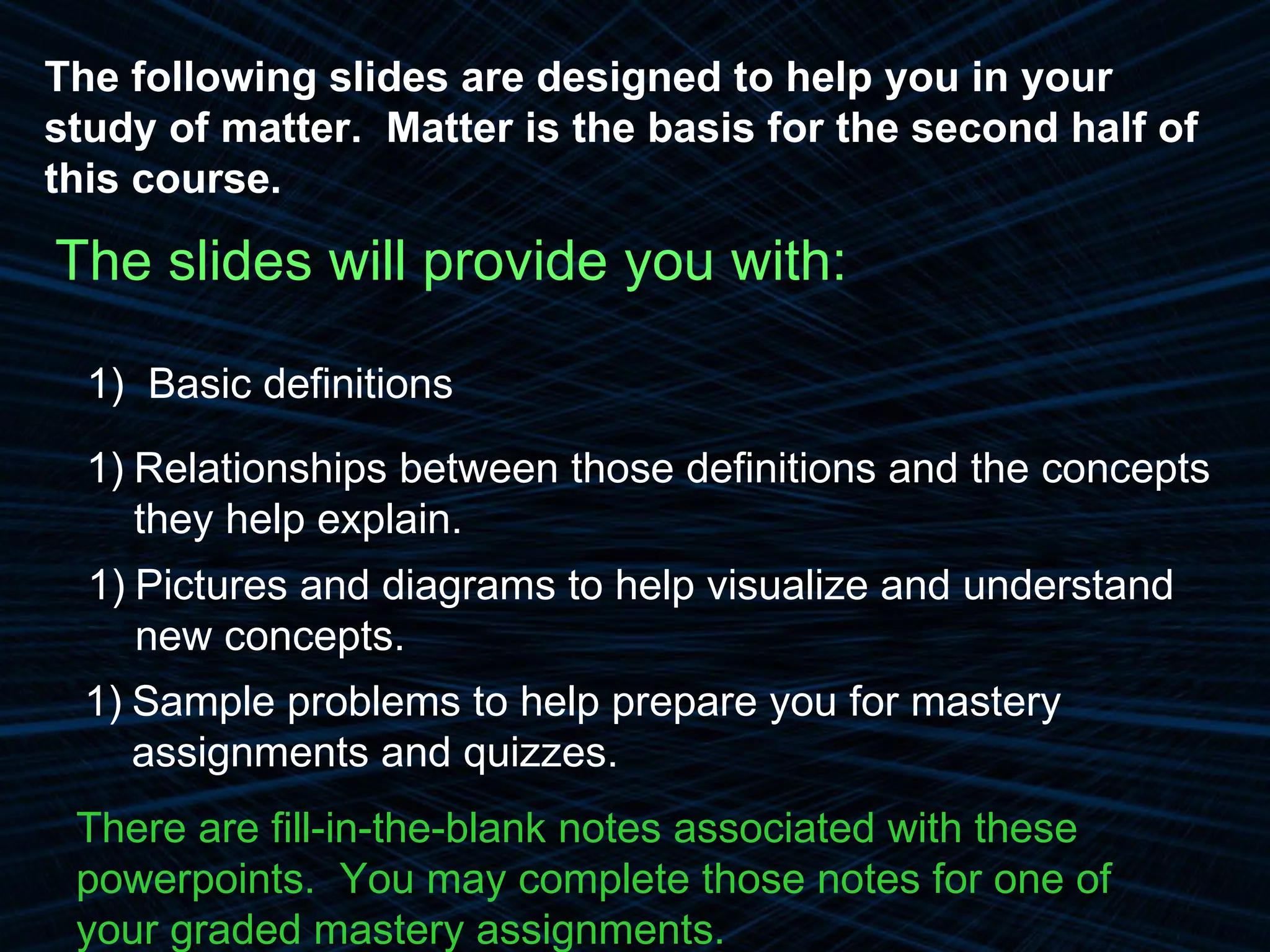 The document provides an overview of classifying and studying matter. It defines matter as anything having mass and volume. It discusses the basic units of matter being atoms and classifies matter as either pure substances (elements or compounds) or mixtures. Elements contain only one type of atom, while compounds are made of two or more different elements that are chemically combined. Mixtures are combinations of substances that are not chemically combined and can be separated physically. Mixtures are either homogeneous, appearing uniform throughout, or heterogeneous, visibly different throughout. Examples and diagrams are provided to illustrate these key concepts.