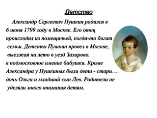 Александр Сергеевич Пушкин родился 6 июня 1799 года в Москве и провёл детство в помещичьей семье, получив образование в Царскосельском лицее, где начал писать стихи. Пушкин создал значимые произведения, такие как «Евгений Онегин» и «Капитанская дочка», а также женился на Наталье Гончаровой и стал отцом четверых детей. Поэт погиб на дуэли 27 января 1837 года, и его похоронили на кладбище святогорского монастыря.