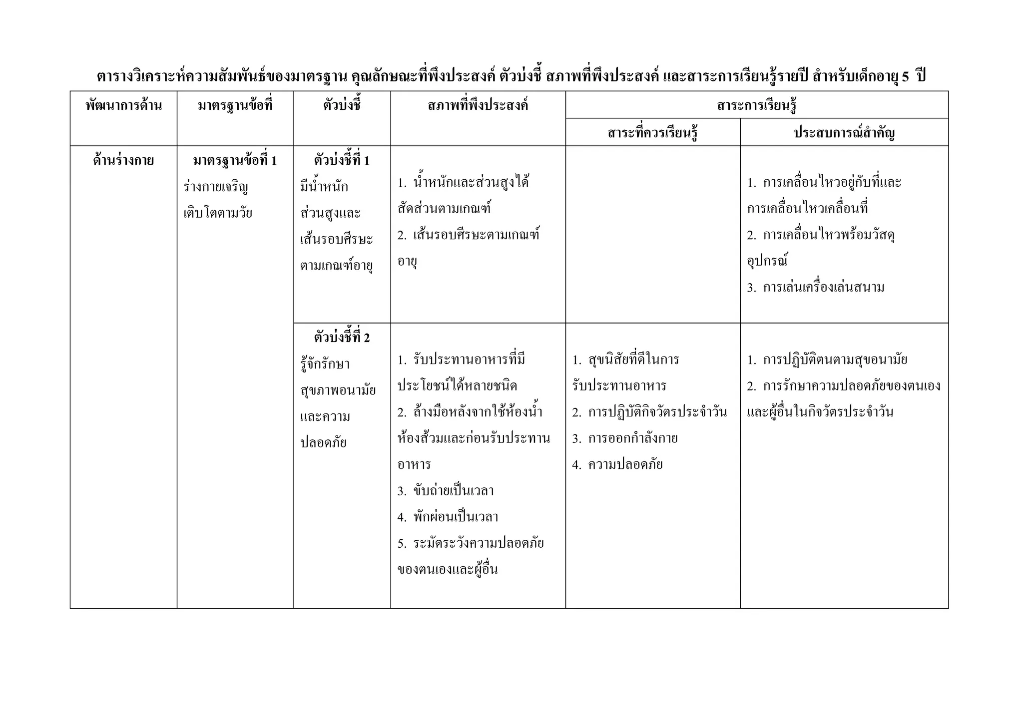 ของมาตรฐาน คุณลักษณะทีพงประสงค์ ตัวบ่ งชี้ สภาพทีพงประสงค์ และสาระการเรียนรู้ รายปี สํ าหรับเด็กอายุ 5 ปี ่ ึ ่ ึ พัฒนาการด้ าน มาตรฐานข้ อที่ ตัวบ่ งชี้ สภาพทพงประสงค์ ี่ ึ สาระการเรียนรู้ สาระทควรเรียนรู้ ี่ ประสบการณ์สําคัญ ด้ านร่ างกาย มาตรฐานข้ อที่ 1 ตัวบ่ งชี้ที่ 1 รางกายเจริญ มีน้ําหนัก 1. น้ําหนักและสวนสูงได 1. การเคลื่อนไหวอยูกับที่และ เติบโตตามวัย สวนสูงและ สัดสวนตามเกณฑ การเคลื่อนไหวเคลื่อนที่ เสนรอบศีรษะ 2. เสนรอบศีรษะตามเกณฑ 2. การเคลื่อนไหวพรอมวัสดุ ตามเกณฑอายุ อายุ อุปกรณ 3. การเลนเครื่องเลนสนาม ตัวบ่ งชี้ที่ 2 รูจักรักษา 1. รับประทานอาหารที่มี 1. สุขนิสัยที่ดีในการ 1. การปฏิบัติตนตามสุขอนามัย สุขภาพอนามัย ประโยชนไดหลายชนิด รับประทานอาหาร 2. การรักษาความปลอดภัยของตนเอง และความ 2. ลางมือหลังจากใชหองน้ํา 2. การปฏิบัติกิจวัตรประจําวัน และผูอื่นในกิจวัตรประจําวัน ปลอดภัย หองสวมและกอนรับประทาน 3. การออกกําลังกาย อาหาร 4. ความปลอดภัย 3. ขับถายเปนเวลา 4. พักผอนเปนเวลา 5. ระมัดระวังความปลอดภัย ของตนเองและผูอื่น