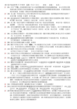 (A )17.選出關於海底熱泉的正確敘述: A 含有鐵、銅、鋅等元素,若遇到冰冷海水則沉澱出金屬