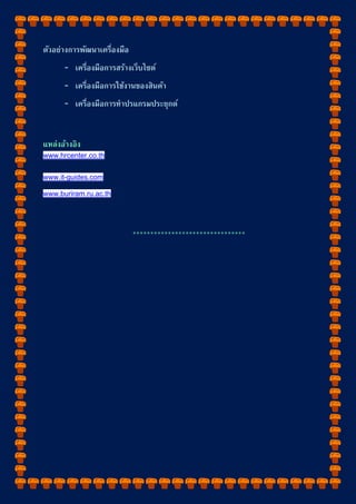 ่ - เครืองมือการสร้างเว็บไซต์ ่ - เครืองมือการใช้งานของสินค้า ่ - เครืองมือการทาปรแกรมประยุกต์ ่ แหล่งอ้างอิง www.hrcenter.co.th www.it-guides.com www.buriram.ru.ac.th ********************************