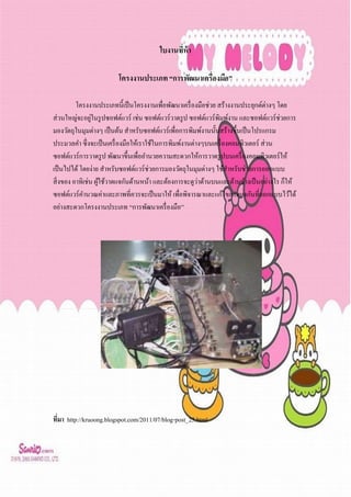่ โครงงานประเภท “การพัฒนาเครื่องมือ” โครงงานประเภทนี้เป็ นโครงงานเพื่อพัฒนาเครื่ องมือช่วย สร้างงานประยุกต์ต่างๆ โดย ส่ วนใหญ่จะอยูในรู ปซอฟต์แวร์ เช่น ซอฟต์แวร์ วาดรู ป ซอฟต์แวร์ พิมพ์งาน และซอฟต์แวร์ ช่วยการ ่ มองวัตถุในมุมต่างๆ เป็ นต้น สาหรับซอฟต์แวร์ เพื่อการพิมพ์งานนั้นสร้างขึ้นเป็ นโปรแกรม ประมวลคา ซึ่ งจะเป็ นเครื่ องมือให้เราใช้ในการพิมพ์งานต่างๆบนเครื่ องคอมพิวเตอร์ ส่ วน ซอฟต์แวร์ การวาดรู ป พัฒนาขึ้นเพื่ออานวยความสะดวกให้การวาดรู ปบนเครื่ องคอมพิวเตอร์ ให้ เป็ นไปได้ โดยง่าย สาหรับซอฟต์แวร์ ช่วยการมองวัตถุในมุมต่างๆ ใช้สาหรับช่วยการออกแบบ ่ สิ่ งของ อาทิเช่น ผูใช้วาดแจกันด้านหน้า และต้องการจะดูวาด้านบนและด้านข้างเป็ นอย่างไร ก็ให้ ้ ซอฟต์แวร์ คานวณค่าและภาพที่ควรจะเป็ นมาให้ เพื่อพิจารณาและแก้ไขภาพแจกันที่ออกแบบไว้ได้ อย่างสะดวกโครงงานประเภท “การพัฒนาเครื่ องมือ” ทีมา http://kruoong.blogspot.com/2011/07/blog-post_25.html ่