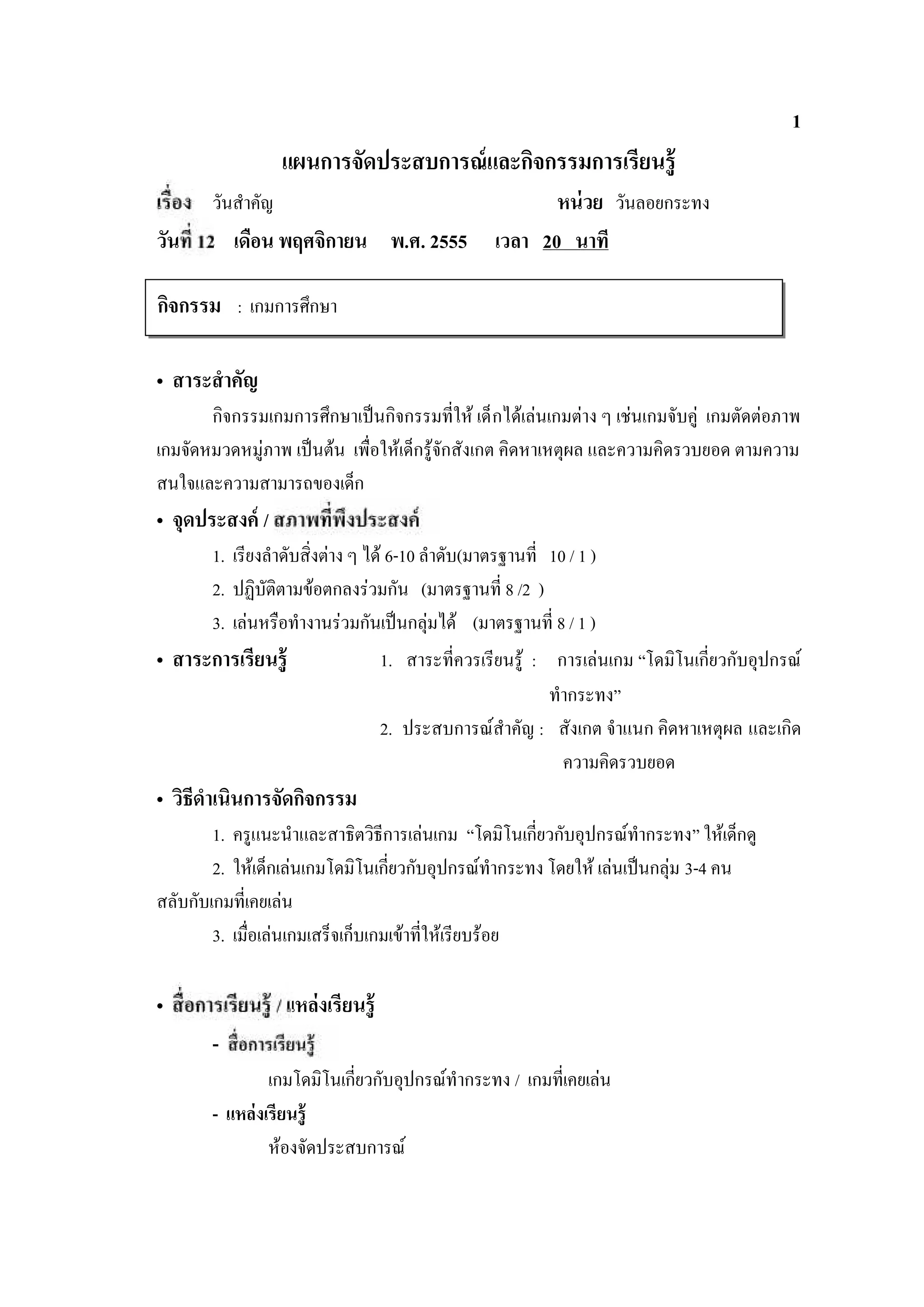 แผนการจัดประสบการณ์ และกิจกรรมการเรียนรู้ วันสําคัญ หน่ วย วันลอยกระทง วัน 16 เดือน พฤศจิกายน พ.ศ. 2555 เวลา 20 นาที กิจกรรม : เกมการศึกษา • สาระสํ าคัญ กิจกรรมเกมการศึกษาเปนกิจกรรมที่ให เด็กไดเลนเกมตาง ๆ เชนเกมจับคู เกมตัดตอภาพ เกมจัดหมวดหมูภาพ เปนตน เพื่อใหเด็กรูจักสังเกต คิ ดหาเหตุผล และความคิดรวบยอด ตามความ สนใจและความสามารถของเด็ก • จุดประสงค์ / 1. เรียงลําดับสิ่งตาง ๆ ได 6-10 ลําดับ (มาตรฐานที่ 10 / 1 ) 2. ปฏิบัติตามขอตกลงรวมกัน (มาตรฐานที่ 8 /2 ) 3. เลนหรือทํางานรวมกันเปนกลุมได (มาตรฐานที่ 8 / 1 ) • สาระการเรียนรู้ 1. สาระที่ควรเรียนรู : การเลนเกม “ภาพตัดตอเกี่ยวกับ วันลอยกระทง” 2. ประสบการณสําคัญ : สังเกต จําแนก คิดหาเหตุผล และเกิด ความคิดรวบยอด • วิธีดําเนินการจัดกิจกรรม 1. ครูแนะนําและสาธิตวิธีการเลนเกม “ภาพตัดตอเกี่ยวกับวันลอยกระทง” ใหเด็กดู 2. ใหเด็กเลนเกมภาพตัดตอเกี่ยวกับวันลอยกระทง โดยให เลนเปนกลุม 3-4 คน สลับกับเกมที่เคยเลน 3. เมื่อเลนเกมเสร็จเก็บเกมเขาที่ใหเรียบรอย • / แหล่งเรียนรู้ - ภาพตัดตอเกี่ยวกับวันลอยกระทง / เกมที่เคยเลน - แหล่ งเรี ยนรู้ หองจัดประสบการณ