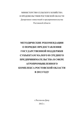 Документ содержит методические рекомендации по предоставлению государственной поддержки малым и средним предпринимателям в агропромышленном комплексе Ростовской области в 2012 году. Описаны условия и направления субсидирования, включая возмещение затрат на кредиты, приобретение техники и семян, страхование и другие аспекты поддержки агробизнеса. Программа направлена на устойчивое развитие сельских территорий и повышение конкурентоспособности местной сельскохозяйственной продукции.