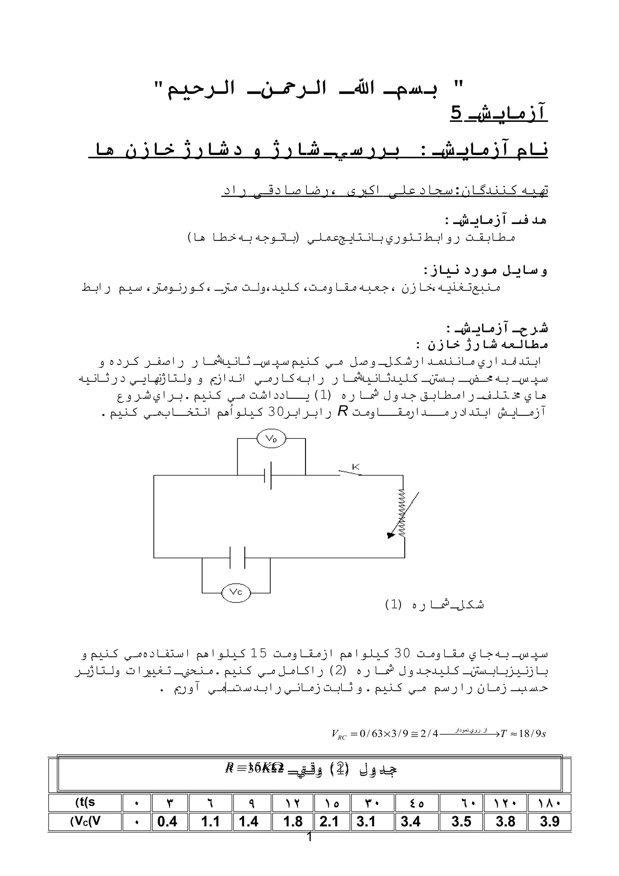 این آزمایش به بررسی شارژ و دشارژ خازنها میپردازد و هدف آن تطابق روابط تئوری با نتایج عملی است. نویسندگان آزمایش به تحلیل تغییرات ولتاژ و زمان در فرآیندهای شارژ و دشارژ پرداختهاند و خطاهای ممکن را بررسی کردهاند. نتایج نشان میدهد که با افزایش مقاومت، زمان شارژ و دشارژ خازن کاهش مییابد.