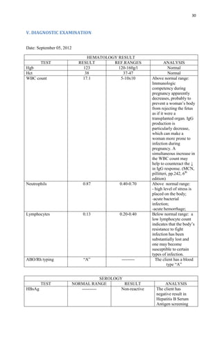 The diagnostic examination results show that the patient's hemoglobin, hematocrit, and neutrophil levels are within normal ranges. However, the white blood cell count is above the normal range, which can occur during pregnancy to help counteract the decrease in IgG response and increased risk of infection. The lymphocyte count is below the normal range, indicating a loss of resistance to fight infections and increased susceptibility. The patient's blood type is A and screening for Hepatitis B was negative.