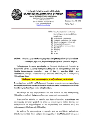 ΘΕΜΑ: «Παράλληλες εκδηλώσεις στην 5η Διεθνή Μαθηματική Εβδομάδα 2013