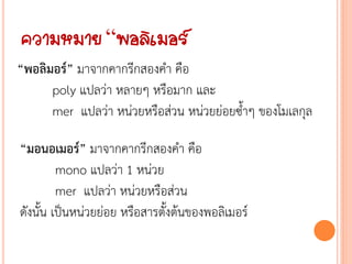 mer แปลว่า หน่วยหรือส่วน หน่วยย่อยซ้าๆ ของโมเลกุล