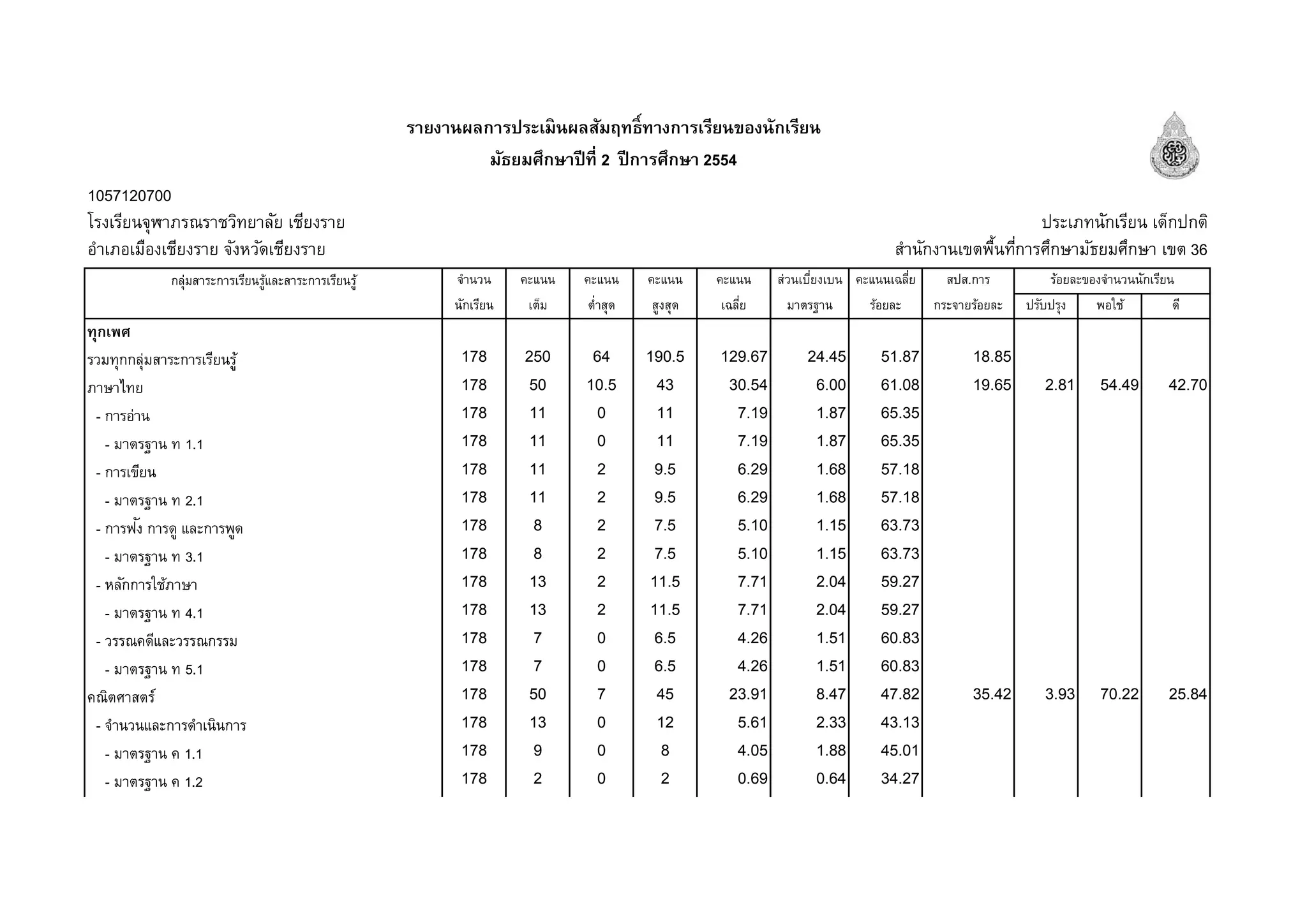 คะแนน คะแนน คะแนน ส่วนเบี่ยงเบน คะแนนเฉลี่ย สปส.การ นักเรียน เต็ม ต่าสุด สูงสุด เฉลี่ย มาตรฐาน ร้อยละ กระจายร้อยละ ปรับปรุง พอใช้ ดี ทุกเพศ รวมทุกกลุ่มสาระการเรียนรู้ 178 250 64 190.5 129.67 24.45 51.87 18.85 ภาษาไทย 178 50 10.5 43 30.54 6.00 61.08 19.65 2.81 54.49 42.70 - การอ่าน 178 11 0 11 7.19 1.87 65.35 - มาตรฐาน ท 1.1 178 11 0 11 7.19 1.87 65.35 - การเขียน 178 11 2 9.5 6.29 1.68 57.18 - มาตรฐาน ท 2.1 178 11 2 9.5 6.29 1.68 57.18 - การฟัง การดู และการพูด 178 8 2 7.5 5.10 1.15 63.73 - มาตรฐาน ท 3.1 178 8 2 7.5 5.10 1.15 63.73 - หลักการใช้ภาษา 178 13 2 11.5 7.71 2.04 59.27 - มาตรฐาน ท 4.1 178 13 2 11.5 7.71 2.04 59.27 - วรรณคดีและวรรณกรรม 178 7 0 6.5 4.26 1.51 60.83 - มาตรฐาน ท 5.1 178 7 0 6.5 4.26 1.51 60.83 คณิตศาสตร์ 178 50 7 45 23.91 8.47 47.82 35.42 3.93 70.22 25.84 - จานวนและการดาเนินการ 178 13 0 12 5.61 2.33 43.13 - มาตรฐาน ค 1.1 178 9 0 8 4.05 1.88 45.01 - มาตรฐาน ค 1.2 178 2 0 2 0.69 0.64 34.27 ร้อยละของจานวนนักเรียน รายงานผลการประเมินผลสัมฤทธิ์ทางการเรียนของนักเรียน มัธยมศึกษาปีที่ 2 ปีการศึกษา 2554 1057120700 โรงเรียนจุฬาภรณราชวิทยาลัย เชียงราย ประเภทนักเรียน เด็กปกติ อาเภอเมืองเชียงราย จังหวัดเชียงราย สานักงานเขตพื้นที่การศึกษามัธยมศึกษา เขต 36