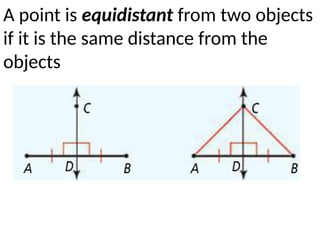 The document discusses the concepts of perpendicular and angle bisectors, highlighting the conditions for a point to be equidistant from two objects or sides of an angle. It includes the perpendicular bisector theorem, its converse, and the angle bisector theorem, along with related problems. Additionally, it addresses practical applications, such as determining locations for a t-shirt stand in a park.