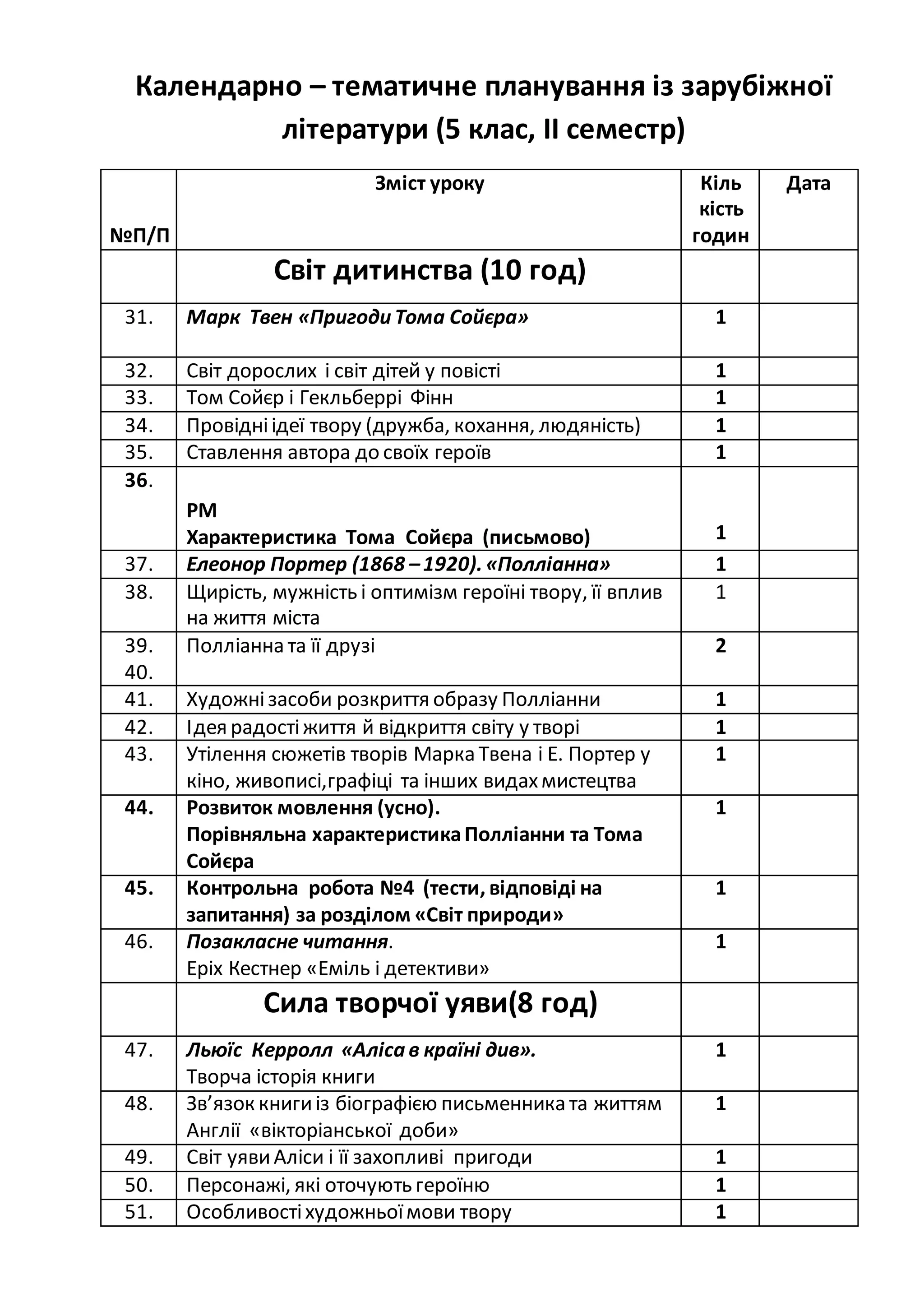 Календарно – тематичнепланування із зарубіжної