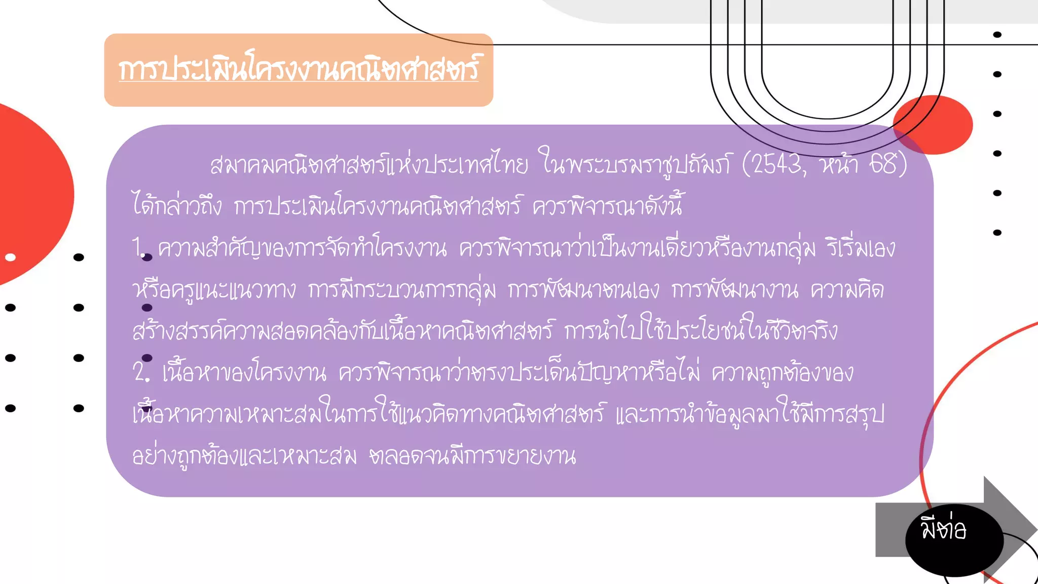การประเมินโครงงานคณิตศาสตร์ สมาคมคณิตศาสตร์แห่งประเทศไทย ในพระบรมราชูปถัมภ์ (2543,