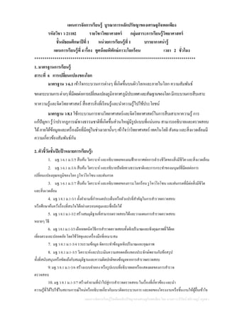 สติราษฎร์ ครูคศ.1 11. มฐ.ว 8.1 ม.1-3/8 บันทึกและอธิบายผลการสังเกต การสารวจ ตรวจสอบค้นคว้าเพิ่มเติม จากแหล่งความรู้ต่างๆให้ได้ข้อมูลที่เชื่อถือได้และยอมรับการเปลี่ยนแปลงความรู้ที่ค้นพบ เมื่อมีข้อมูลและประจักษ์พยานใหม่เพิ่มขึ้นหรือโต้แย้งจากเดิม 12.มฐ.ว8.1ม.1-3/9จัดแสดงผลงานเขียนรายงานและ/หรืออธิบายเกี่ยวกับแนวคิดกระบวนการ และผลของโครงงานหรือชิ้นงานให้ผู้อื่นเข้าใจ 3. สาระสาคัญ/ความคิดรวบยอด การเปลี่ยนแปลงอุณหภูมิของโลกการที่อุณหภูมิของโลกมีค่าเปลี่ยนแปลงไปจากปกติ ซึ่งจะ ส่งผลต่อการดารงชีวิตของมนุษย์และสิ่งแวดล้อม ปัจจัยทางธรรมชาติและการกระทาของมนุษย์ เช่น ปรากฏการณ์เอลนิโญและลานีญา การ ระเบิดของภูเขาไฟ การเปลี่ยนแปลงแนววงโคจรของโลกรอบดวงอาทิตย์ ปรากฏการณ์เรือน กระจก ภาวะโลกร้อน เป็นต้น มีผลทาให้เกิดการเปลี่ยนแปลงอุณหภูมิของโลก โดยปรากฏการณ์ ที่อุณหภูมิเฉลี่ยของโลกสูงขึ้นเรียกว่า ภาวะโลกร้อน ภาวะโลกร้อนทาให้เกิดการละลายของธารน้าแข็ง ระดับน้าทะเลสูงขึ้นการกัดเซาะชายฝั่ง เพิ่มขึ้น น้าท่วม ไฟป่า ส่งผลให้สิ่งมีชีวิตบางชนิดสูญพันธุ์ และทาให้สิ่งแวดล้อมเปลี่ยนแปลงไป นอกจากนี้รูโหว่โอโซน และฝนกรดมีผลต่อการเปลี่ยนแปลงของสิ่งมีชีวิตและสิ่งแวดล้อม 4. จุดประสงค์การเรียนรู้ 1. สืบค้นวิเคราะห์และอธิบายผลของลมฟ้าอากาศต่อการดารงชีวิตของสิ่งมีชีวิตและสิ่งแวดล้อม (P) 2. สืบค้น วิเคราะห์ และอธิบายปัจจัยทางธรรมชาติ และการกระทาของมนุษย์ที่มีผลต่อการ เปลี่ยนแปลงอุณหภูมิ ของโลก รูโหว่โอโซน และฝนกรด (P) 3. สืบค้นวิเคราะห์และอธิบายผลของภาวะโลกร้อน รูโหว่โอโซนและฝนกรดที่มีต่อสิ่งมีชีวิตและ สิ่งแวดล้อม (P) 4. ประยุกต์ใช้ปรัชญาของเศรษฐกิจพอเพียงในการรณรงค์ภาวะโลกร้อนและรักษาสภาพแวดล้อมทาง อากาศ(A) 5. สาระการเรียนรู้ 1. ผลของลมฟ้าอากาศต่อการดารงชีวิตของสิ่งมีชีวิตและสิ่งแวดล้อม 2. ปัจจัยทางธรรมชาติ และการกระทาของมนุษย์ที่มีผลต่อการเปลี่ยนแปลงอุณหภูมิ ของโลก รูโหว่โอโซน และฝนกรด 3. ผลของภาวะโลกร้อน รูโหว่โอโซนและฝนกรดที่มีต่อสิ่งมีชีวิตและสิ่งแวดล้อม