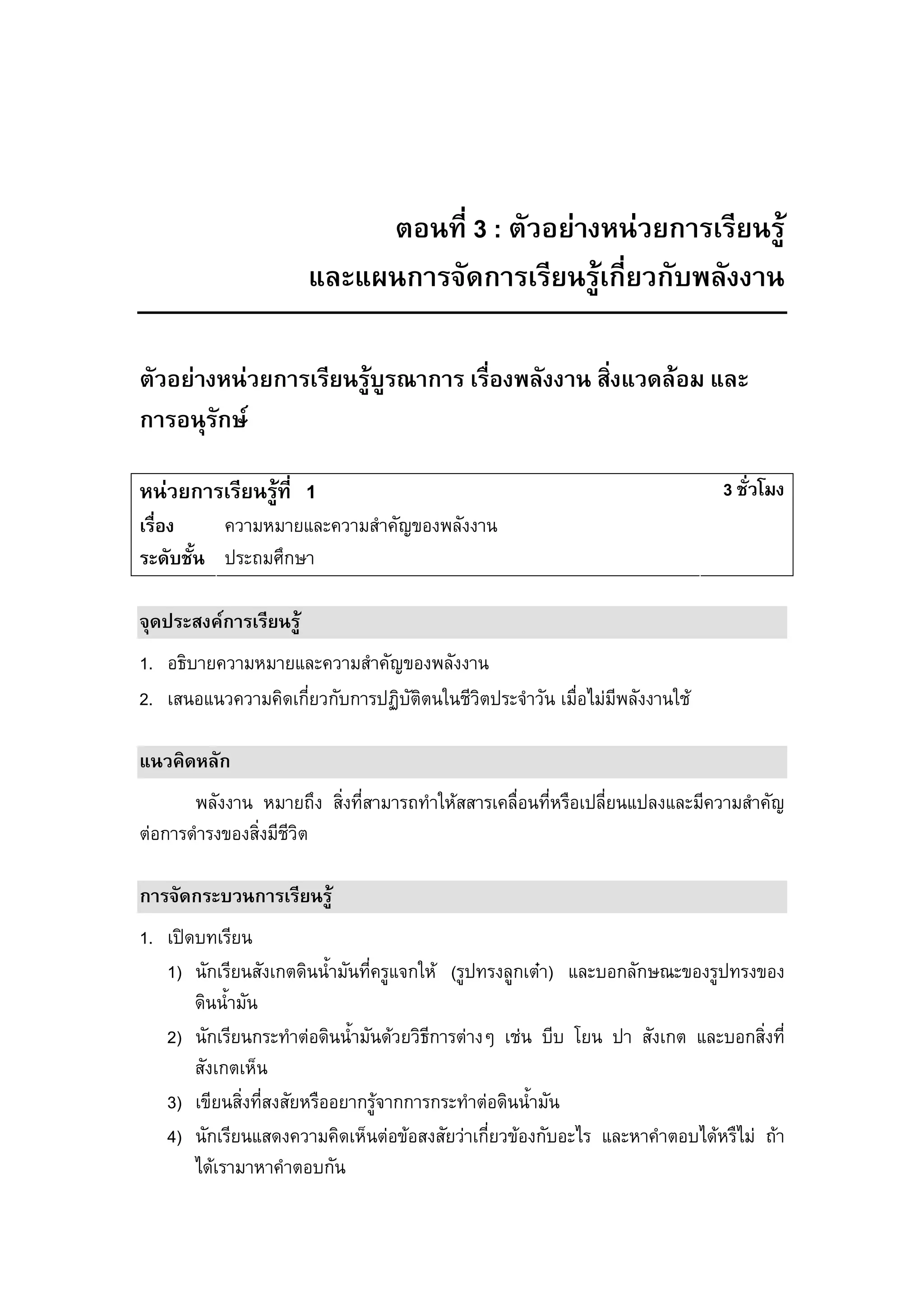 ตัวอยางหนวยการเรียนรู และแผนการจัดการเรียนรูเกี่ยวกับพลังงาน ตัวอยางหนวยการเรียนรูบูรณาการ เรื่องพลังงาน สิ่งแวดลอม และ การอนุรักษ หนวยการเรียนรูที่ 1 3 ชั่วโมง เรื่อง ความหมายและความสําคัญของพลังงาน ระดับชั้น ประถมศึกษา จุดประสงคการเรียนรู 1. อธิบายความหมายและความสําคัญของพลังงาน 2. เสนอแนวความคิดเกี่ยวกับการปฏิบติตนในชีวตประจําวัน เมื่อไมมีพลังงานใช ั ิ แนวคิดหลัก พลังงาน หมายถึง สิ่งที่สามารถทําใหสสารเคลื่อนที่หรือเปลี่ยนแปลงและมีความสําคัญ ตอการดํารงของสิ่งมีชีวิต การจัดกระบวนการเรียนรู 1. เปดบทเรียน 1) นักเรียนสังเกตดินน้ํามันที่ครูแจกให (รูปทรงลูกเตา) และบอกลักษณะของรูปทรงของ ดินน้ํามัน 2) นักเรียนกระทําตอดินน้ํามันดวยวิธีการตางๆ เชน บีบ โยน ปา สังเกต และบอกสิ่งที่ สังเกตเห็น 3) เขียนสิ่งทีสงสัยหรืออยากรูจากการกระทําตอดินน้ํามัน ่ 4) นักเรียนแสดงความคิดเห็นตอขอสงสัยวาเกี่ยวของกับอะไร และหาคําตอบไดหรืไม ถา ไดเรามาหาคําตอบกัน