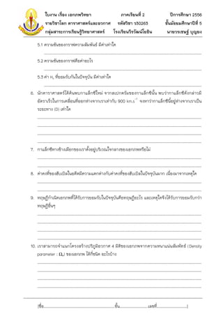 2 รายวิชาโลก ดาราศาสตร์และอวกาศ รหัสวิชา ว30263 กลุ่มสาระการเรียนรู้วิทยาศาสตร์ โรงเรียนวีรวัฒน์โยธิน ปีการศึกษา 2556 ชั้นมัธยมศึกษาปีท่ี 5 นายวรเชษฐ์ บุญยง 5.1 ความชันของกราฟความสัมพันธ์ มีคาเท่าใด ่ ……………………………………………………………………………………………………………………………………….……………… 5.2 ความชันของกราฟคือค่าอะไร ……………………………………………………………………………………………………………………………………….……………… 5.3 ค่า Ho ที่ยอมรับกันในปัจจุบัน มีค่าเท่าใด ……………………………………………………………………………………………………………………………………….……………… 6. นักดาราศาสตร์ได้ค้นพบกาแล็กซีใหม่ จากสเปกตรัมของกาแล็กซีนั้น พบว่ากาแล็กซีดังกล่าวมี อัตราเร็วในการเคลื่อนที่ออกห่างจากเราเท่ากับ 900 km.s-1 จงหาว่ากาแล็กซีนี้อยู่ห่างจากเราเป็น ระยะทาง (D) เท่าใด ………………………………………………………………………………………………………………………………………….…………….…… ………………………………………………………………………………………………………………………………………….…………….…… ………………………………………………………………………………………………………………………………………….…………….…… ………………………………………………………………………………………………………………………………………….…………….…… 7. กาแล็กซีทางช้างเผือกของเราตั้งอยู่บริเวณใจกลางของเอกภพหรือไม่ ………………………………………………………………………………………………………………………………………….…………….…… ………………………………………………………………………………………………………………………………………….…………….…… 8. ค่าคงที่ของฮับเบิลในอดีตมีความแตกต่างกับค่าคงที่ของฮับเบิลในปัจจุบันมาก เนื่องมาจากเหตุใด ………………………………………………………………………………………………………………………………………….…………….…… ………………………………………………………………………………………………………………………………………….…………….…… 9. ทฤษฏีกาเนิดเอกภพที่ได้รับการยอมรับในปัจจุบันคือทฤษฏีอะไร และเหตุใดจึงได้รับการยอมรับกว่า ทฤษฏีอ่นๆ ื ………………………………………………………………………………………………………………………………………….…………….…… ………………………………………………………………………………………………………………………………………….…………….…… ………………………………………………………………………………………………………………………………………….…………….…… ………………………………………………………………………………………………………………………………………….…………….…… 10. เราสามารถจาแนกโครงสร้างปริภูมิอวกาศ 4 มิติของเอกภพจากความหนาแน่นสัมพัทธ์ (Density parameter : Ωo) ของเอกภพ ได้กี่ชนิด อะไรบ้าง ………………………………………………………………………………………………………………………………………….…………….…… ………………………………………………………………………………………………………………………………………….…………….…… ………………………………………………………………………………………………………………………………………….…………….…… ………………………………………………………………………………………………………………………………………….…………….…… [ชื่อ……………………………………………………………………ชั้น………………………….เลขที……………………………] ่