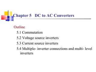 This document provides an overview of DC to AC converters known as inverters. It discusses various types of inverters including voltage source inverters and current source inverters. It covers topics such as commutation types, single phase and three phase inverter circuit configurations, quantitative analysis of output voltages, and methods for controlling output voltages. The document also discusses connecting multiple inverters in series to generate higher voltage output waveforms and the use of multi-level inverters to reduce harmonic distortion.