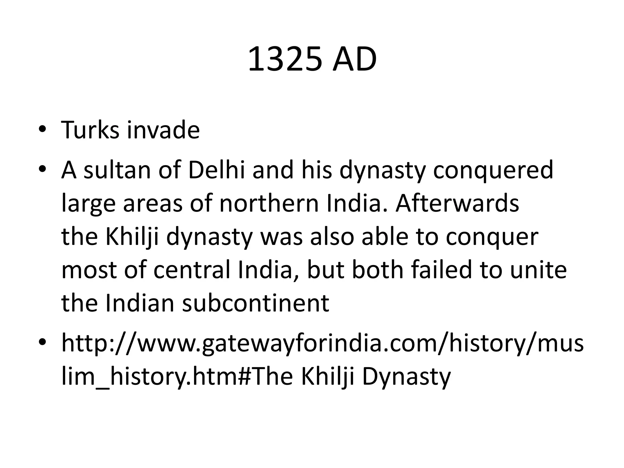 Turks invaded northern India in 1325 AD, establishing the Delhi Sultanate. A sultan of Delhi and his dynasty conquered large areas of northern India. The subsequent Khilji dynasty also conquered most of central India, though neither was able to unite all of India under their rule.