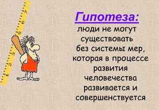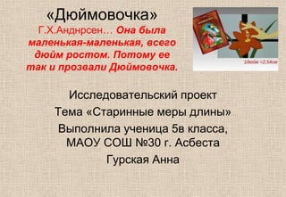 Документ представляет исследовательский проект ученицы о старинных мерах длины, основанный на теме сказки Г.Х. Андерсена 'Дюймовочка'. В нём рассматривается гипотеза о вариативности старинной меры дюйма и её зависимости от размеров человеческого тела, а также приводятся результаты практических измерений роста 'дюймовочек' у разных людей. Автор также планирует поделиться знаниями о старинных мерах длины через словари и литературные примеры.