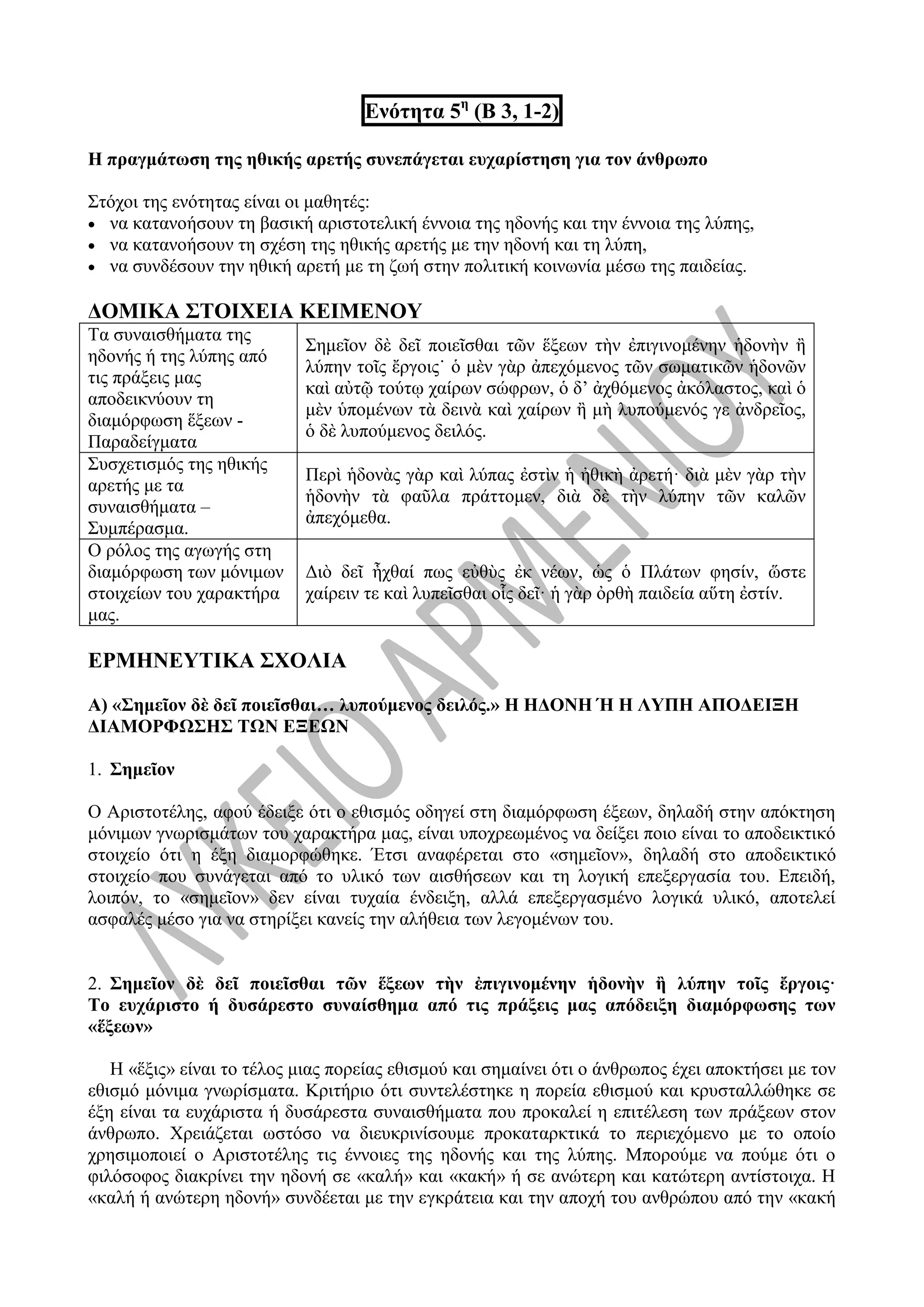 με την οποία την πρόβαλλε (αἱ κατ’ ἀρετὴν πράξεις εἰσὶν ἡδεῖαι). Ας δούμε όμως αναλυτικότερα