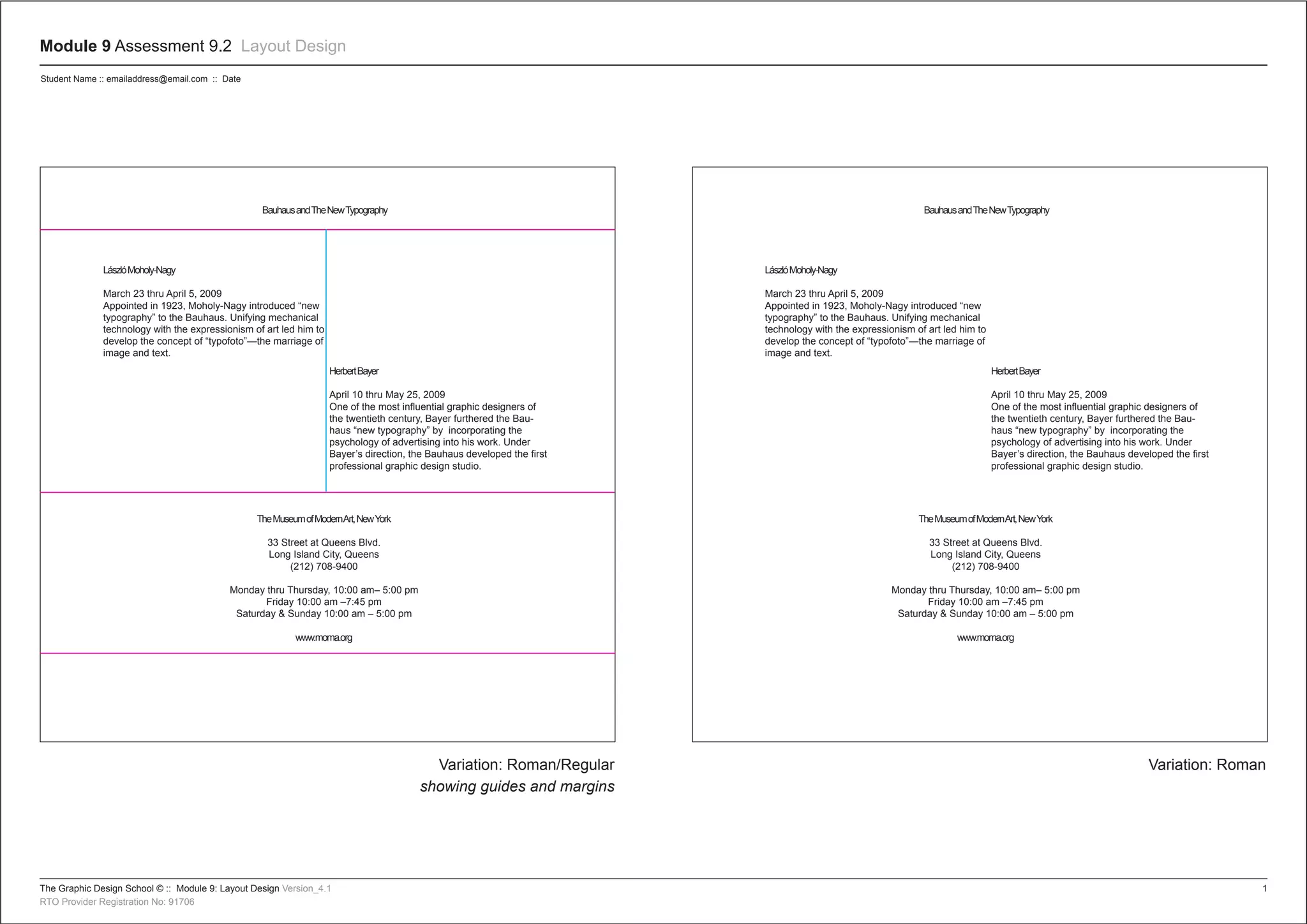 The document describes an exhibition at the Museum of Modern Art in New York City about the "New Typography" developed at the Bauhaus. It provides information on the exhibition dates and details about two featured artists: László Moholy-Nagy and Herbert Bayer. Moholy-Nagy introduced the concept of combining images and text ("typofoto") while head of the Metal Workshop at the Bauhaus in 1923. Bayer further developed the New Typography and established the first professional graphic design studio under his direction at the Bauhaus.
