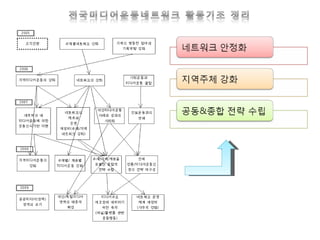 IPTV, Mobile 지상파디지털 전환과 주파수 재배치 운동 대중 기술 국가 지역미디어센터 추진협의회 전국미디어운동네트워크 1 기 2 기 2-1 기 네트워크 운영 및 논의 구조 구축 지역과 영역의 공동 & 종합 전략 수립 시도 대중적 확산 시도 공적 제도 ( 미디어센터 ) 형성 중심 ‘ 공동체미디어’ 실천 & 논의 확대 전체 언론미디어운동의 재구성 촛불 촛불 대중의 자발적 커뮤니케이션 능력 성장 ( 온라인 / 상업미디어 중심 ) Mobile, SNS, 웹 2.0 방 송 ( 유료 케이블 vs 무료 지상파 ) 통 신