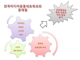 지역의 참여도 하락재미없는 워크샵 주제별네트워크와의 종합적인 논의가 부족함 방통위의 정책내용에 개입하지 못함 사무국의 활동초점 중구난방 활동영역과 주체가 다양해졌지만 모아내지 못함 커뮤니케이션의 트랜드와 괴리 전체 언론미디어운동 속에서 비중 미비 운동의 개념이 불명확 슬로건도 로고도 없음 전국적 이슈에 대한 공동행동은 매우 제한적 워크샵 외에 집중논의 자리가 부족 웹사이트부재 자발성에 기댐 공동의 선택과 공동의 집중은 언제쯤 ? 구속력 없음 주제별네트워크의 구분이 모호함 영상중심 주류미디어에 대한 액세스 중심
