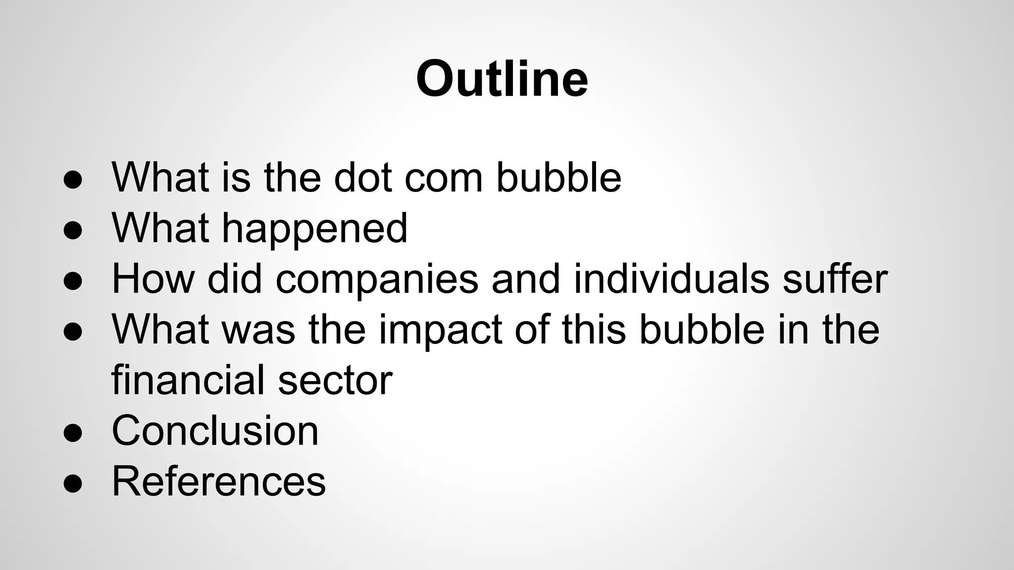 The DotCom Bubble in California occurred from 1997-2000 and was marked by the rapid founding and speculative public stock listings of many new Internet companies. The NASDAQ index peaked in March 2000 before losing half its value by the end of the year as the bubble burst. As the bubble deflated in 2001, many dotcom companies stopped trading or failed altogether. The bubble's bursting led to an economic recession in the US and other countries in the early 2000s and demonstrated how overestimation and speculation can cause market collapses.